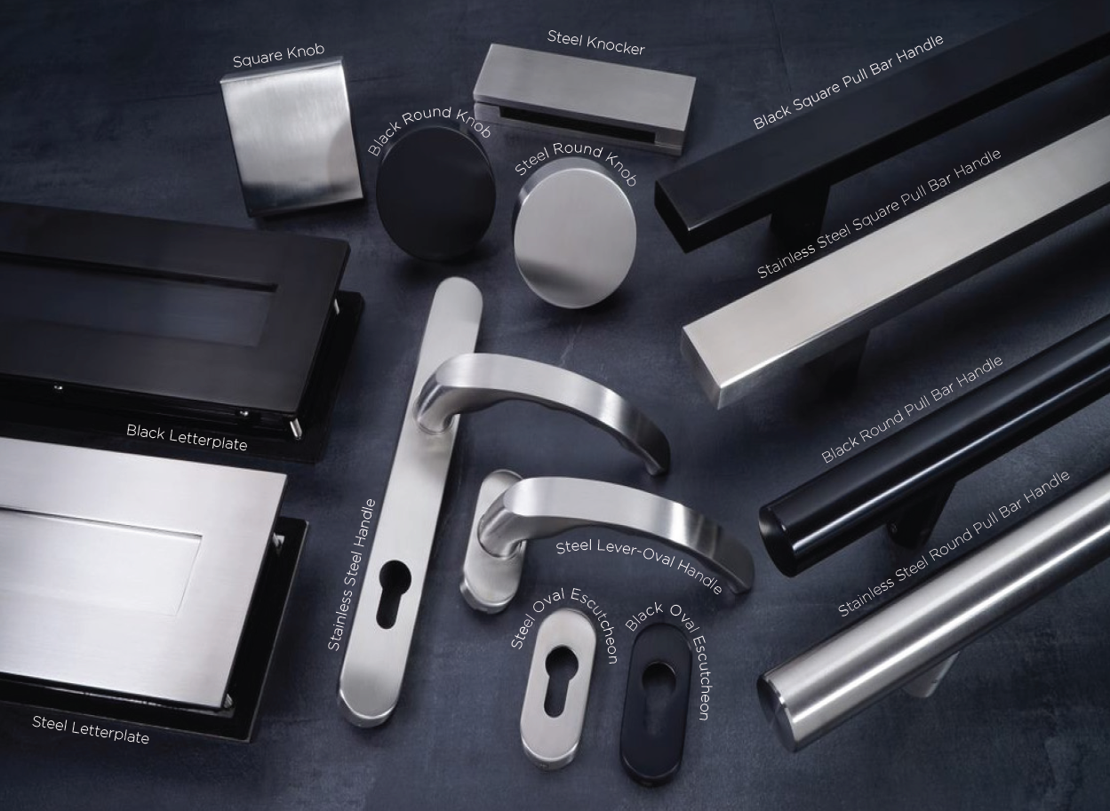 A newly introduced handle option allowing customers to pair key-operated external handles or knobs with sleek, internal lever-on-rose handles. - 1,200mm stainless steel bar pull handles